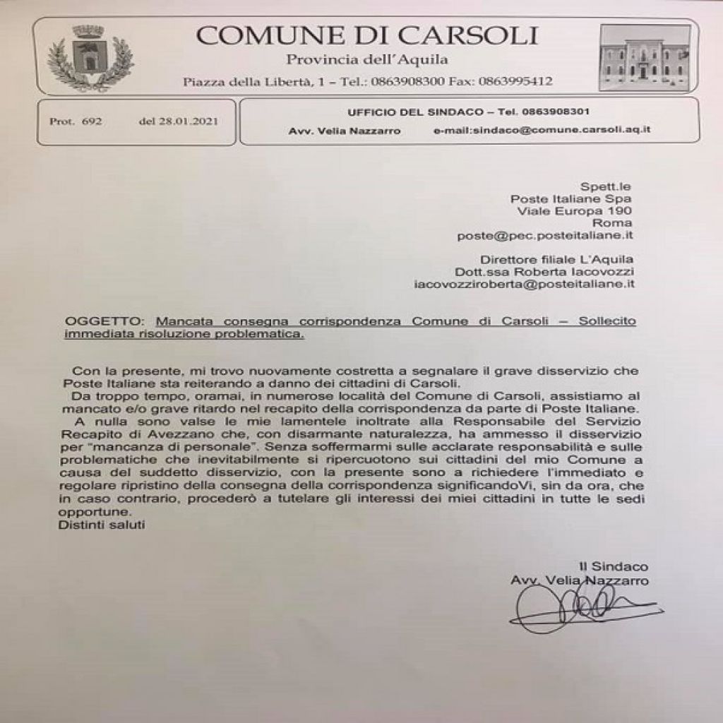 Redazione- Il sindaco di Carsoli, avv. Velia Nazzarro, dopo l'ennessima, e catastrofica, situaizone di disservizio delle POSTE ITALIANE, della filiale di Carsoli, scrive alla direzione centrale per risolvere imemdiatamente il prolungarsi dei disservizi. Riportiamo il post del sindaco Visto il protrarsi del ritardo/mancata consegna della corrispondenza da parte di Poste Italiane nel Comune di Carsoli, ho provveduto ad inviare una lettera sollecitando l’immediata risoluzione del problema. Nei giorni scorsi avevo contattato il servizio recapito di Poste Italiane di Avezzano che, senza alcuna esitazione, ammetteva l’esistenza del problema per “mancanza di personale”. Visto che l’impegno preso di risolvere il tutto non è stato rispettato, ho provveduto a scrivere e, se entro pochi giorni,