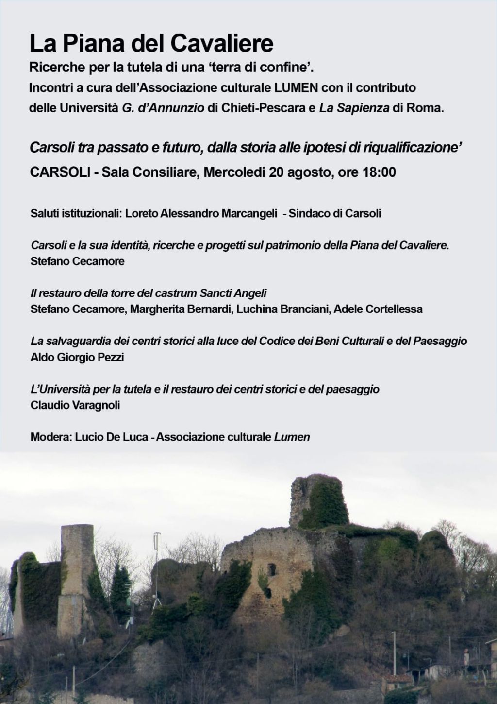 L'iniziativa, promossa dall’Associazione culturale Lumen, ha ricevuto il prezioso contributo delle Università degli Studi di Roma "La Sapienza" e dell'Università degli Studi "G. d'Annunzio" Chieti-Pescara, questo incontro si propone di esplorare la nostra identità locale, il nostro patrimonio storico e le prospettive di riqualificazione.