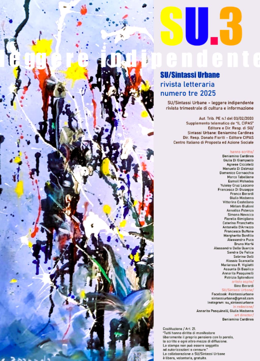 Redazione - A ottobre esce il nuovo numero di SU/Sintassi Urbane leggere indipendente – rivista letteraria, numero 3. La rivista nasce a Pescara da un’idea di Beniamino Cardines (giornalista e scrittore pluripremiato) e da un confronto aperto con Donato Fioriti (Dirigente Nazionale FIGEC/Federazione Italiana Giornalismo Editoria e Comunicazione). Successivamente da una condivisione collettiva e partecipata con autori e autrici italiani contemporanei, tutti concordi a voler informare raccontando.