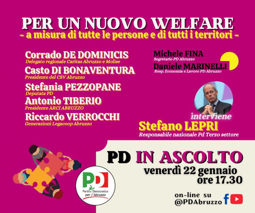 All'incontro "Per un nuovo welfare, a misura di tutte le persone e di tutti i territori" parteciperanno oltre a Michele Fina e Daniele Marinelli, segretario e responsabile economia e lavoro del Pd Abruzzo, Stefano Lepri (responsabile terzo settore del Pd nazionale), Stefania Pezzopane (deputata Pd), Corrado De Dominicis (delegato Caritas Abruzzo e Molise), Casto Di Bonaventura (presidente Csv Abruzzo), Antonio Tiberio (presidente Arci Abruzzo) e Riccardo Verrocchi (Generazioni Legacoop Abruzzo).