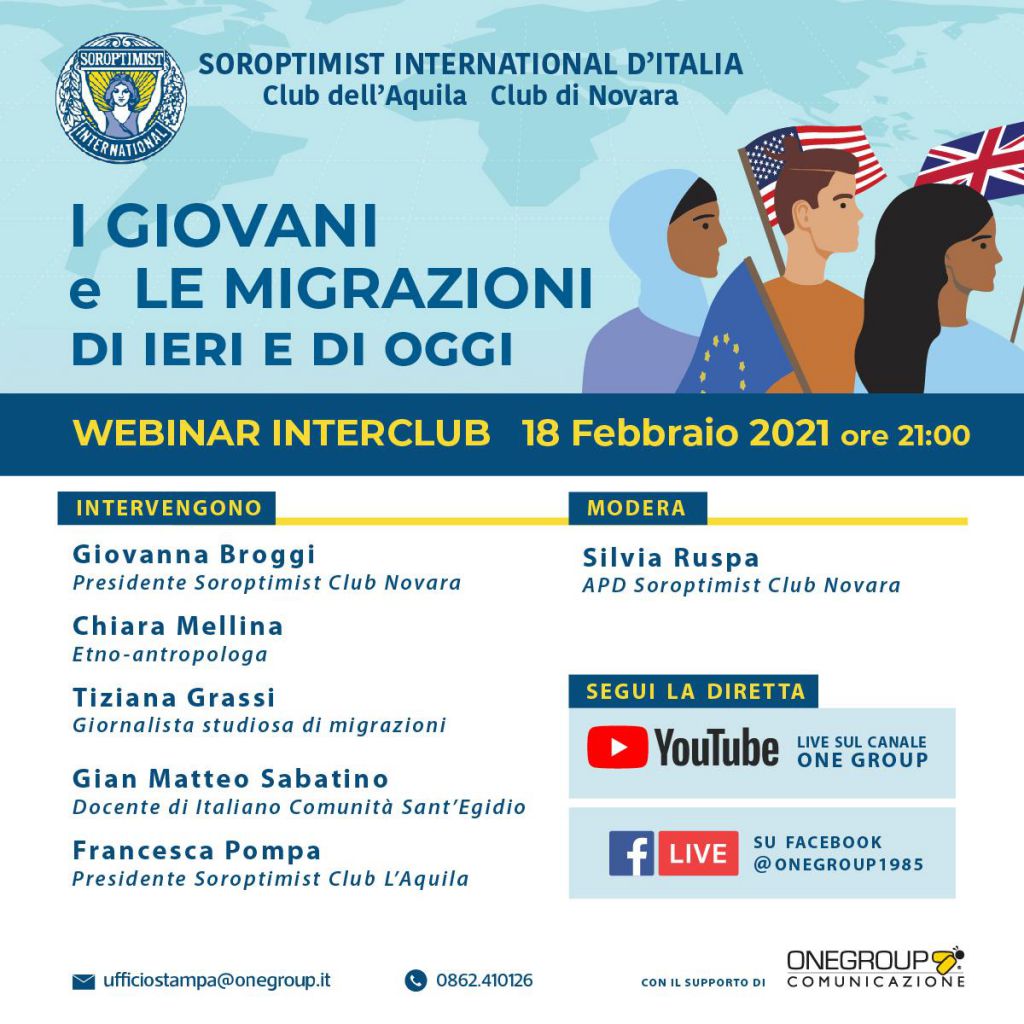 Redazione- Giovedì 18 febbraio, alle ore 21, sulla grande piazza del web, l’incontro del Soroptimist International, Club L’Aquila e Novara, nell'ambito delle proprie azioni di advocacy, sul fenomeno delle migrazioni dei giovani di ieri e di oggi, di quelli che vanno e di quelli che vengono.Giovanna Broggi, Presidente Soroptimist International Club di Novara introdurrà relatori appartenenti a vari universi professionali che rifletteranno sullo status di migrante di seconda generazione, minore non accompagnato, giovane migrante italiano fra Ottocento e Novecento e giovane migrante italiano contemporaneo. Crisi, fragilità, ma anche opportunità offerte dall'altrove.Parteciperanno Chiara Mellina, etnoantropologa, Tiziana Grassi, giornalista, scrittrice e studiosa di fenomeni migratori, Gian Matteo Sabatino, docente di italiano Comunità di Sant'Egidio, Francesca Pompa, imprenditrice culturale e Presidente Soroptimist Club L'Aquila. Modererà la serata, Silvia Ruspa, APD Soroptimist Club Novara.
