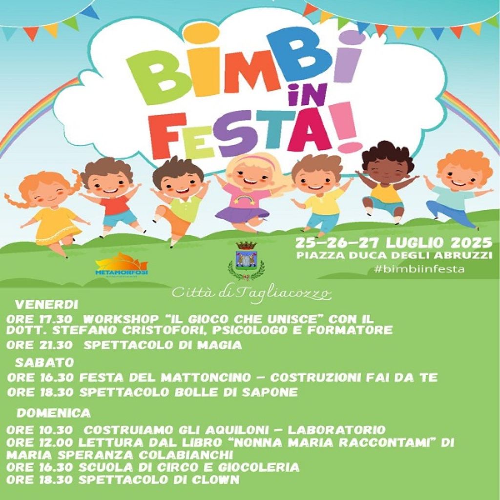 Redazione- Torna anche quest’anno, come terza edizione, “Bimbi in Festa”, l’evento organizzato il quarto weekend di luglio dal Comune di Tagliacozzo e dedicato al divertimento dei bambini e delle famiglie. Una manifestazione molto attesa dai più piccini, che si conferma essere uno degli appuntamenti più amati dell’estate: tre giorni ricchi di attività ludiche, laboratori formativi, spettacoli e momenti di condivisione, pensati per creare spazi relazionali tra i giovanissimi e le loro famiglie. A tal proposito l’edizione 2025 si arricchisce di una novità importante e significativa: un work shop dal titolo “Il Piacere del Gioco”, un pomeriggio speciale dedicato non solo ai bambini ma anche agli adulti che li accompagnano nella crescita. A guidare l’incontro sarà il Dott. Stefano Cristofori, psicologo e formatore, esperto nell’approccio dinamico-relazionale adulto-bambino. Un’esperienza pratica e teorica pensata per genitori, educatori, insegnanti e per chiunque voglia scoprire o riscoprire il gioco come linguaggio profondo di connessione, cura e apprendimento. Il programma di “Bimbi in festa” è ricco e variegato: spettacoli teatrali coinvolgenti, letture animate, laboratori per stimolare fantasia e manualità, musica, giochi e tanto divertimento all’aria aperta.