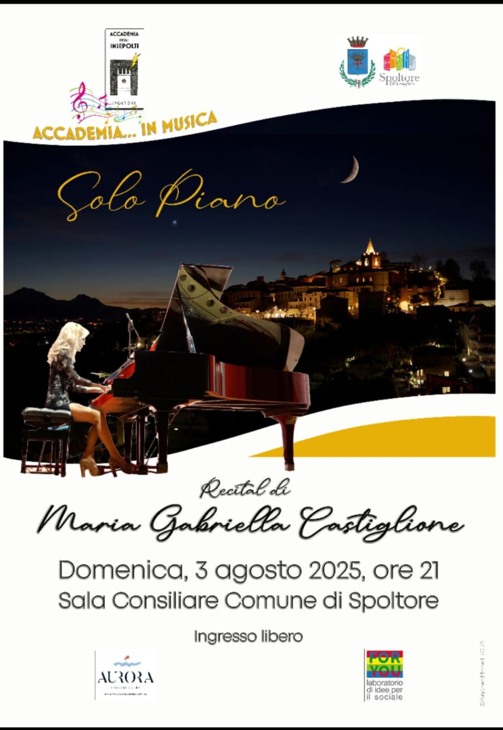 Redazione- La sala consiliare del Comune di Spoltore (Pe) ospiterà domenica 3 agosto alle ore 21:00, il recital di pianoforte "Solo Piano" di Maria Gabriella Castiglione.L'evento, organizzato dall'Accademia degli Insepolti del Presidente Elisabetta Di Luca con il patrocinio del Comune di Spoltore guidato dal Sindaco Chiara Trulli, promette un viaggio musicale che spazierà dai capolavori classici a brani più moderni, eseguiti con la maestria e la sensibilità che contraddistinguono l'artista.
