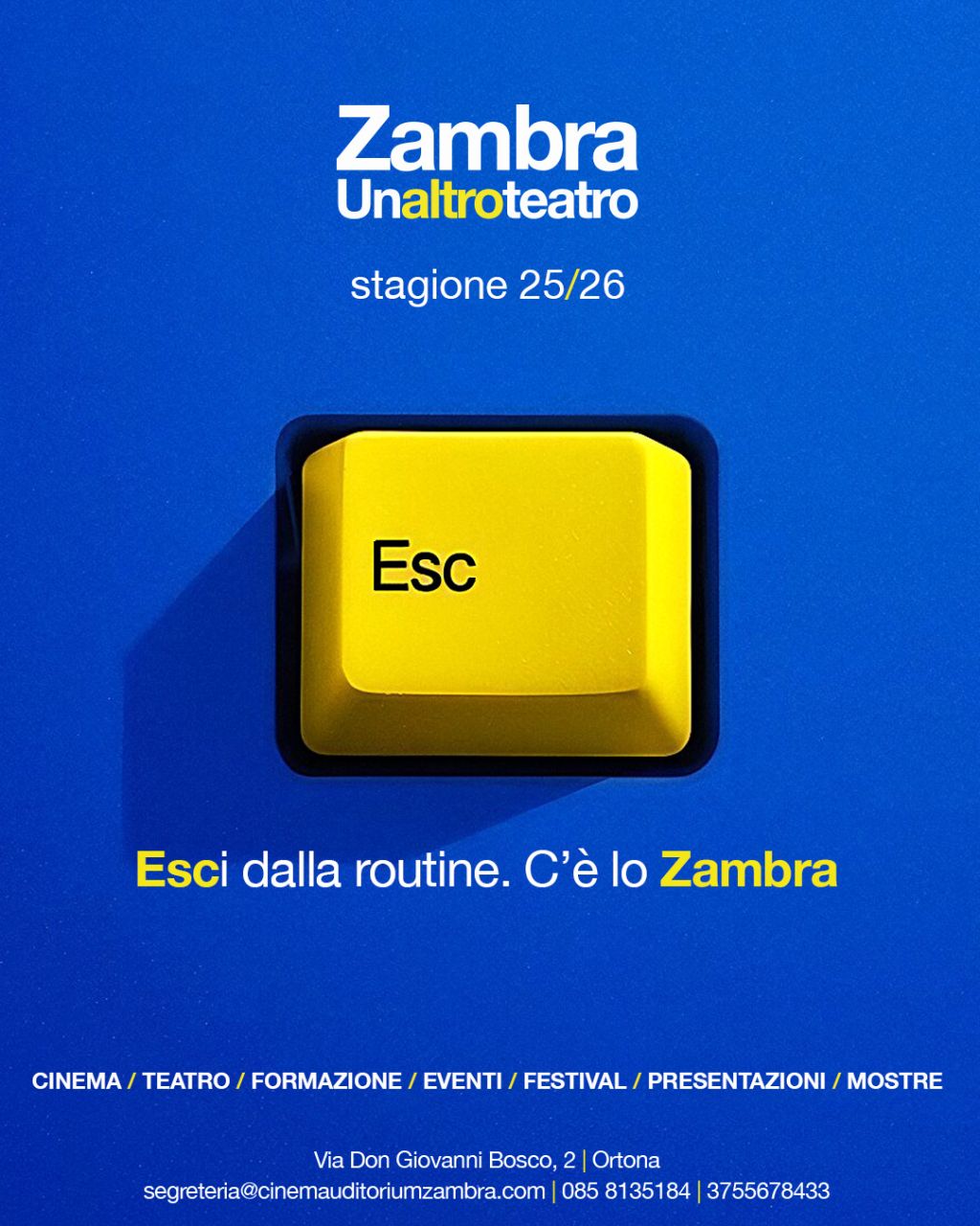 È possibile fare l'abbonamento per la stagione teatrale 2025/26, i biglietti sono in prevendita su www.liveticket.it a partire dal 1 settembre. Per info è possibile chiamare il numero 085.8135184, mandare un whatsapp al 375.5678433 o una mail a Questo indirizzo email è protetto dagli spambots. È necessario abilitare JavaScript per vederlo.. Sito: www.cinemauditoriumzambra.com.