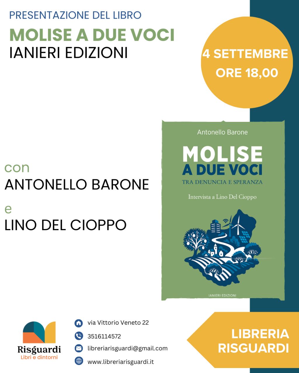 Redazione- Un dialogo coraggioso sul futuro del Molise, tra criticità e opportunità: questo il tema al centro del libro “Molise a due voci” (Ianieri edizioni), che sarà presentato il 4 settembre alle ore 18:00 presso la libreria Risguardi a Campobasso (via Vittorio Veneto 22).