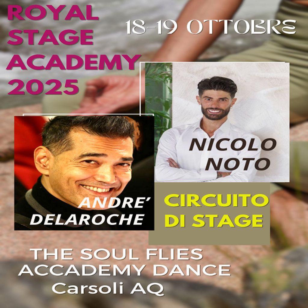 Redazione- Il 18 e 19 Ottobre presso l'Accademia di danza THE SOUL FLIES ACADEMY DANCE, di Carsoli AQ, torna l'evento nazionale di danza ROYAL STAGE ACADEMY. Otto anni, dall'inizio di questo circuito di stage di alta formazione alla danza, che in questa edizione, oltre a maestri che arrivano da tutta Italia, ci saranno i maestri internazionali Nicolo' Noto, ed il maestro ANDRE DE LA ROCHE. Potranno partecipare allievi dai sette anni in su. A fine evento saranno consegnate borse di studio Nazionali ed Internazionali, e l'attestato di partecipazione, valido per i crediti extra scolastici.