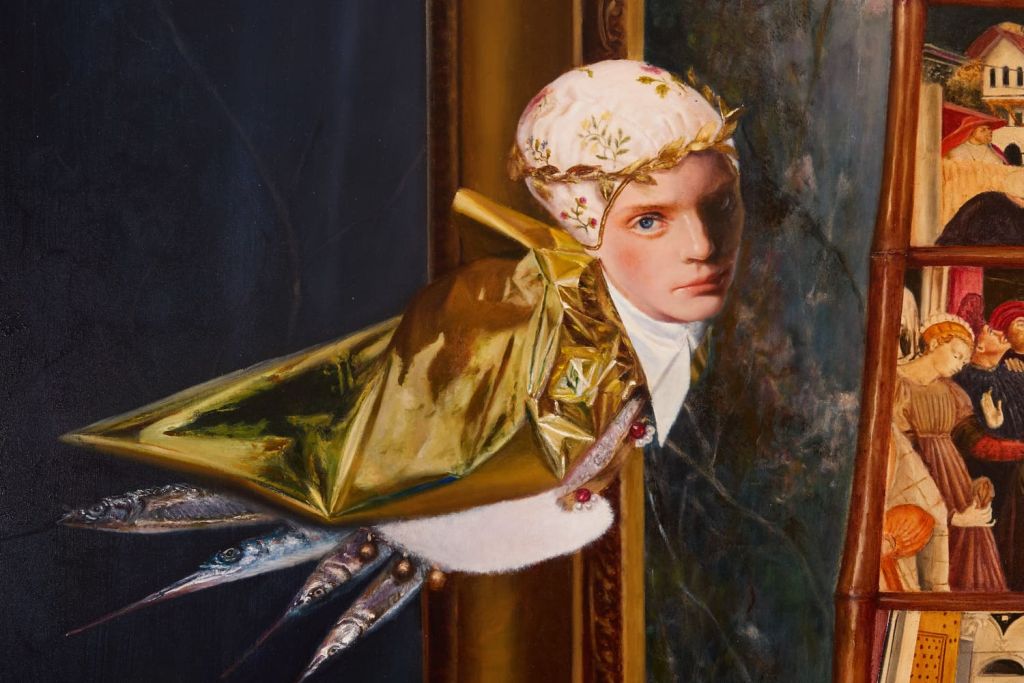 Nell’opera intitolata Still Life with Lilies (2025) una natura morta di reliquie sacre acquistate dall’Imperatrice di Costantinopoli si organizza attorno al Chiodo della Croce di Cristo, trasformato in fulcro luminoso della composizione; in The Ladder (2025) l’artista rielabora gli affreschi del Vecchietta, ricomponendoli in una scala sospesa tra la terra e il cielo; in Restoring the World (2025) una fanciulla angelica custodisce una boccetta col sangue di Cristo, fragile e potente al tempo stesso, come promessa di rinascita.
