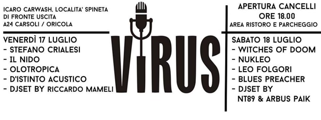 Oricola--il 17 e il 18 Luglio si svolgerà, presso l'autolavaggio Icaro Carwash, località Spineta, di fronte l'uscita Carsoli / Oricola della A24, la prima edizione del Virus Festival. Musicisti e dj si esibiranno per due serate di grande musica!