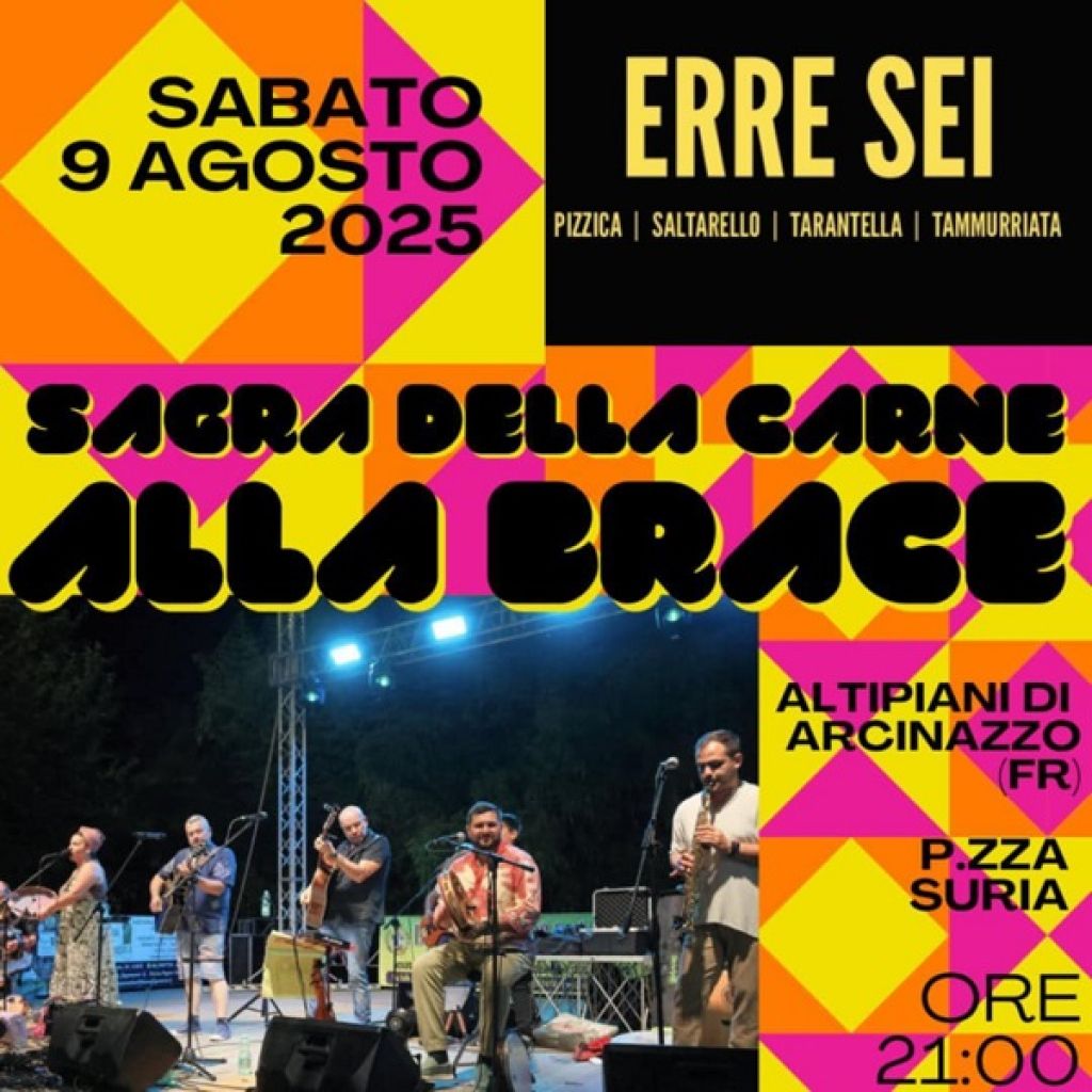 Redazione- Negli splenditi piani di Arcinazzo, il 9 Agosto a Piazza Suria la musica popolare del gruppo ERRESEI, dalle 21 infiammerà la piazza. Nella bellissima cornice enogastronomica della SAGRA DELLA CARNE ALLA BRACE, i passi ed i balli della musica popolare travolgeranno tutti, in un ballo saltato che stravolgerà ogni anima, in energia pura.