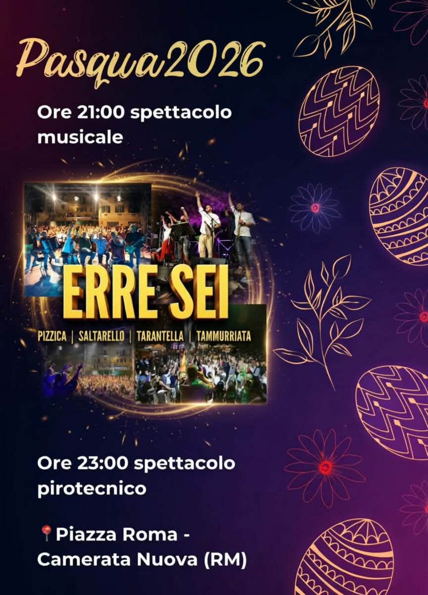 Redazione- A Pasqua, per smaltire il grande pranzo, a Camerata Nuova dalle 21 si Balla con la musica popolare del favoloso gruppo ERRESEI. Pizzica, Salterello, Tarantella, Tammuriata, la straordinaria musica popolare del centro sud Italia, che scalderà tutta la piazza. Dopo il conceertone, alle 23 i fuochi pirotecnici, che facciamo