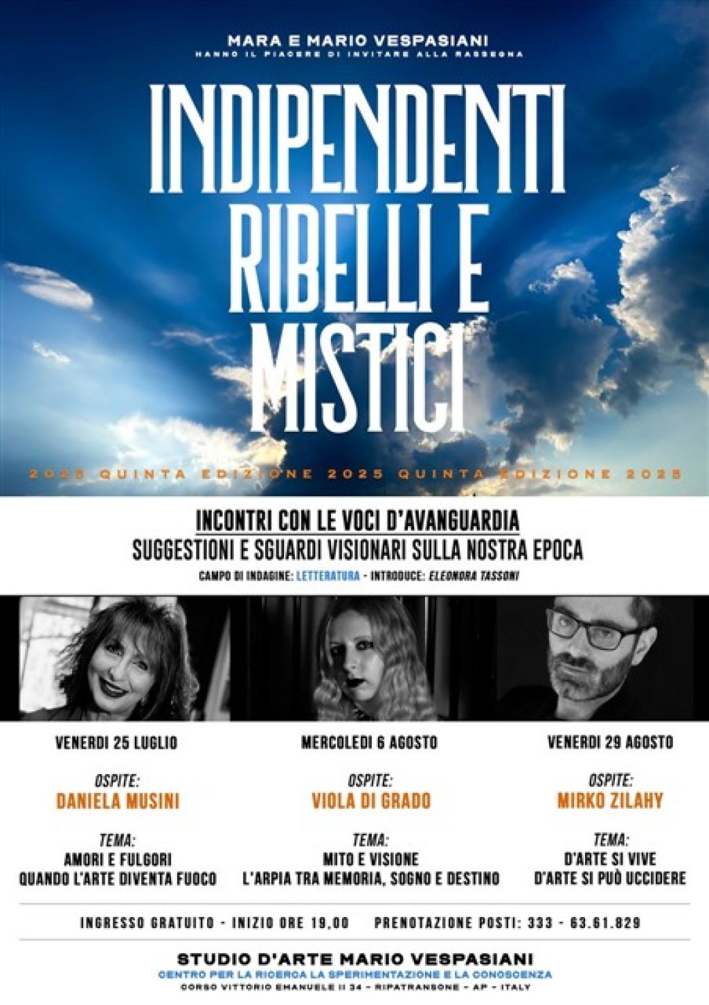 "Indipendenti, Ribelli e Mistici" si conferma così come un progetto culturale dal respiro nazionale, nel riunire gli intellettuali più vari, i quali ciascuno nel proprio campo, testimoniano una dichiarazione di intenti. Vespasiani negli anni ha saputo strutturare una comunità di spiriti affini, una rete di uomini e donne della cultura che, controcorrente, continuano a credere nel potere della parola, della bellezza e del pensiero critico. Ad oggi è l’unico artista visivo ad aver avuto una tale intuizione ed in questo si percepisce ancor meglio la sua missione: non solo quella di creare opere, ma di creare connessioni, offrendo il suo spazio come un presidio di apertura e di umanità per aiutare a leggere e a vivere il nostro tempo complesso senza paura. I tre incontri saranno introdotti da Eleonora Tassoni la cui preparazione e disponibilità daranno lustro alla sezione letteratura, che vanta la collaborazione della Libreria Rinascita di Ascoli Piceno, che ha pienamente appoggiato la validità della rassegna.