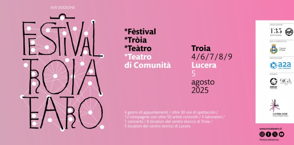 Redazione- Dal 4 al 9 agosto 2025, la città di Troia (FG) accoglierà una nuova edizione del Festival Troia Teatro, appuntamento culturale tra i più attesi dell’estate pugliese: teatro di strada, laboratori artistici, musica, teatro di figura, danza, avvicinamento alle arti circensi e un’esperienza collettiva capace di rigenerare luoghi, legami e visioni condivise. L’evento è organizzato da Teatri 35 e dall’Unione Giovanile Troiana, con la collaborazione del Comune di Troia, il Comune di Lucera - Progetto Lucera Capitale della Cultura della Puglia 2025 - dove si svolgerà l’anteprima del festival e il patrocinio della Provincia di Foggia.