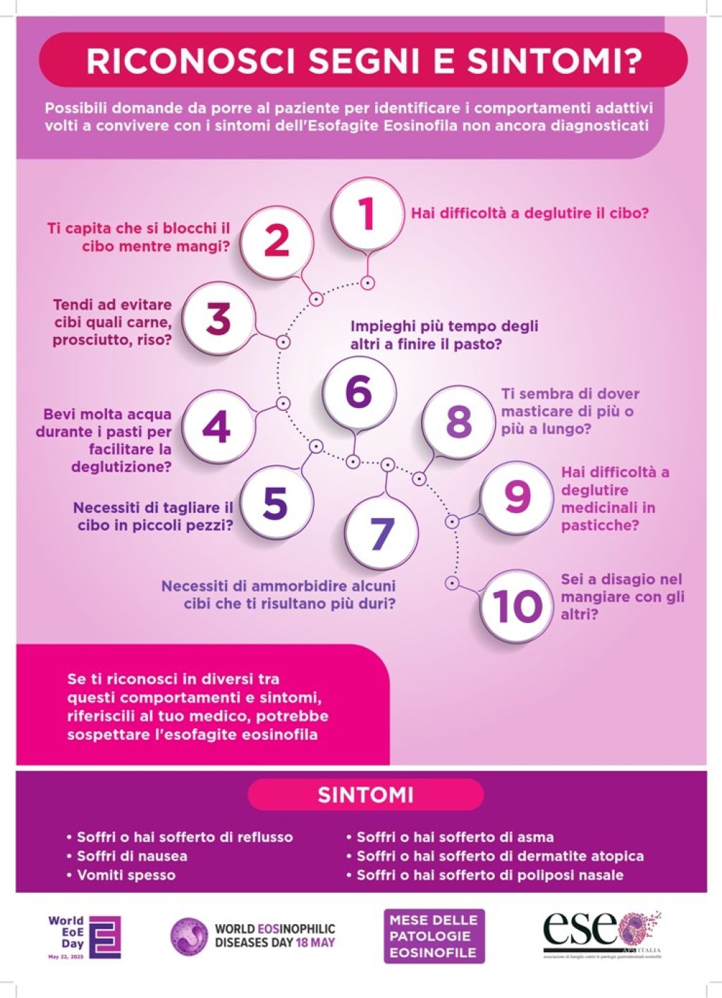L’associazione di pazienti ESEO Italia è nata nel 2017 e persegue finalità di informazione, sensibilizzazione, assistenza sociale e sociosanitaria, ricerca e promozione scientifica in relazione all’Esofagite Eosinofila e alle patologie gastrointestinali eosinofile. www.esoitalia.it.