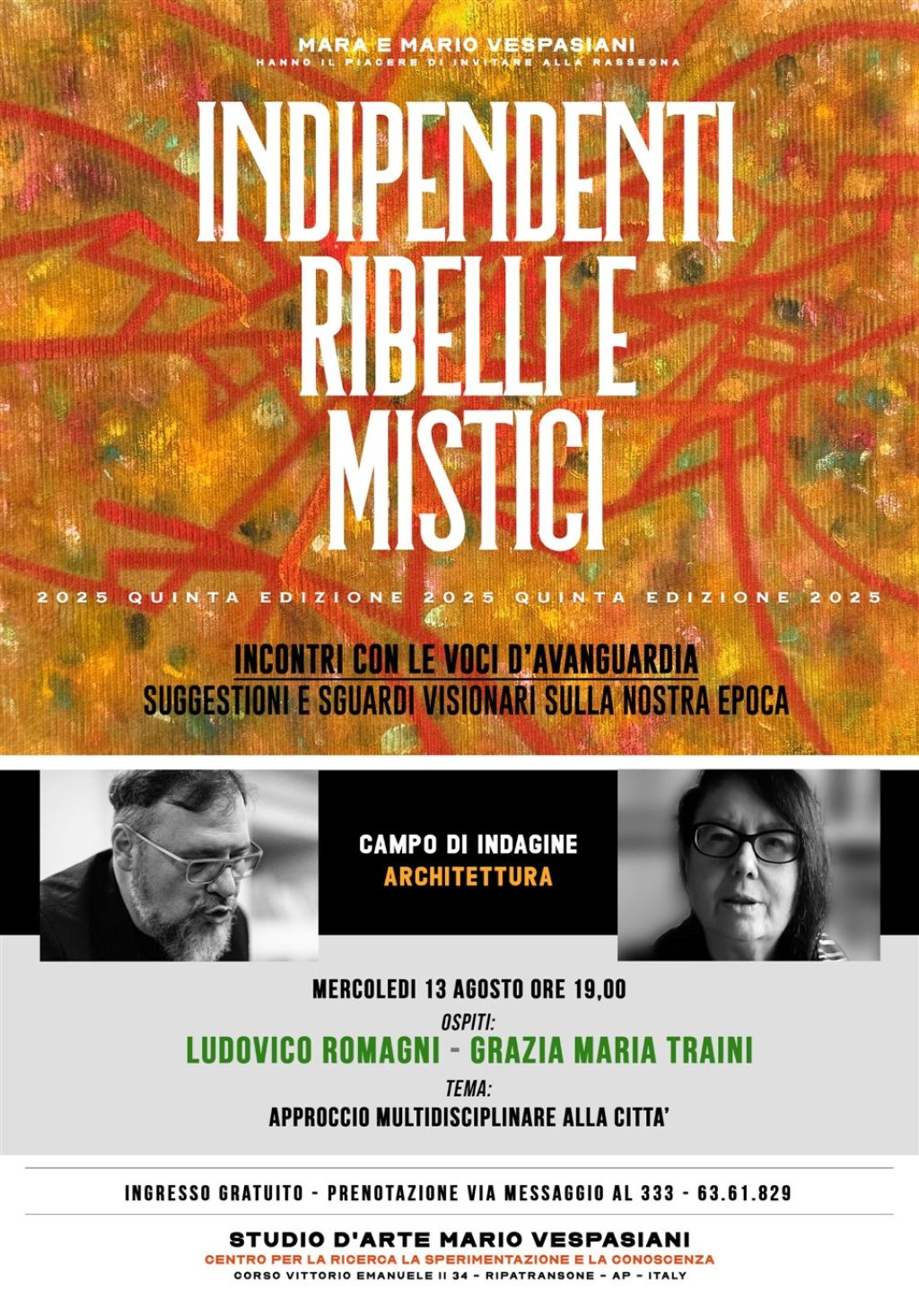 La missione dell’artista, si svela così in tutta la sua ampiezza: non è solo quella di un creatore solitario, ma anche quella di un “urbanista delle relazioni” che si adopera per migliorare la vita dei cittadini, per nutrire e fortificare lo spirito della comunità. "Indipendenti, Ribelli e Mistici" è difatti un progetto unico in Italia, un "cantiere aperto" in cui si progetta la città del futuro, una città fondata su valori profondi e connessioni umane. L'appuntamento con Grazia Maria Traini e Ludovico Romagni è dunque un capitolo significativo di questo percorso, un momento in cui la riflessione si sposta dall'individuo alla collettività, dalla tela alla polis, dimostrando che l'arte, quando è guidata da una visione così lucida e impegnata, è lo strumento più nobile per costruire un mondo più degno di essere abitato.
