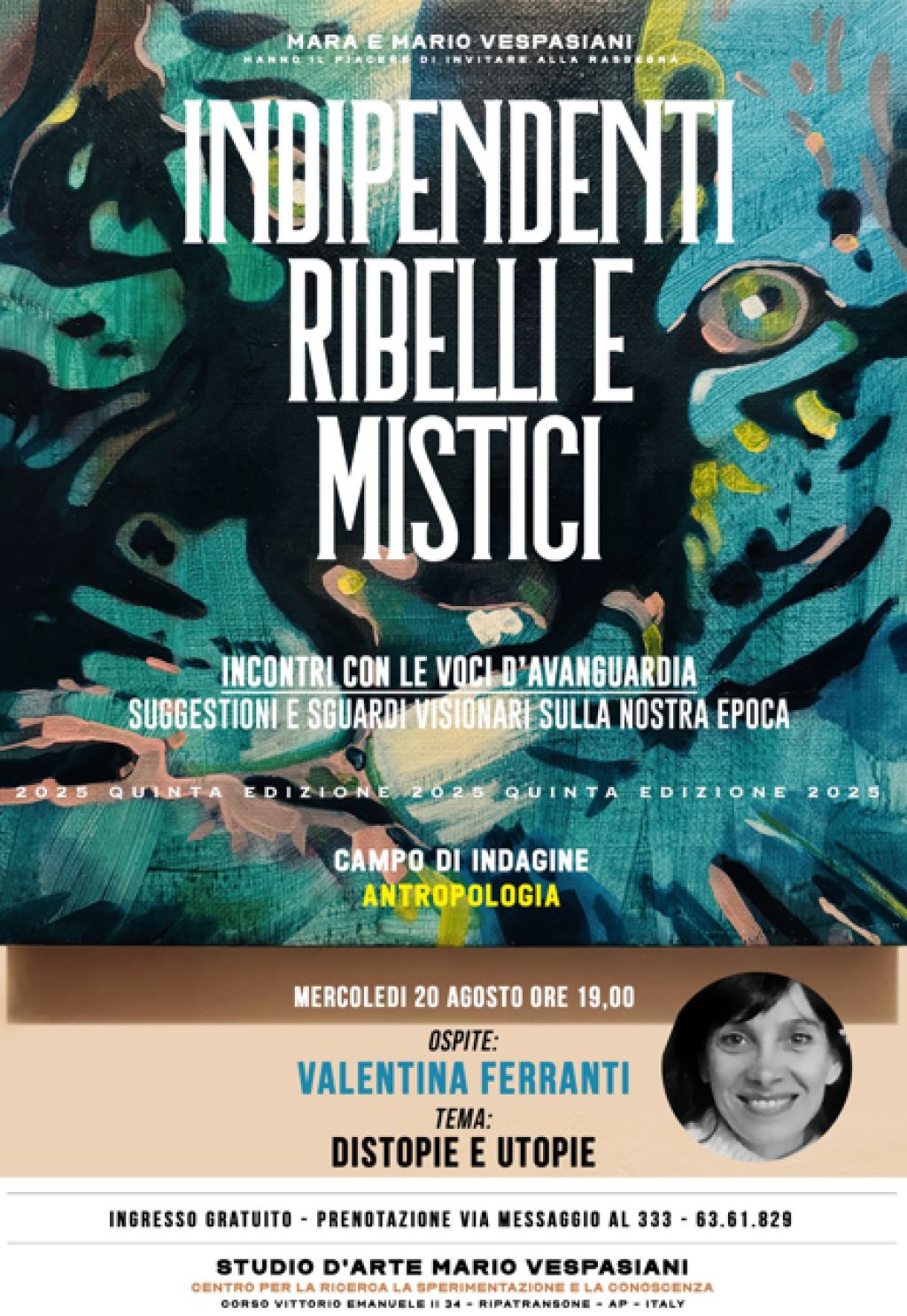Redazione- Prosegue la rassegna Indipendenti, Ribelli e Mistici che anno dopo anno, incontro dopo incontro, si conferma come uno degli avamposti più vivaci e originali del pensiero contemporaneo. Dopo aver attraversato la filosofia con Diego Fusaro, la letteratura con Daniela Musini e successivamente con Viola di Grado, l'architettura con Grazia Maria Traini e Ludovico Romagni, il viaggio prosegue. Mercoledì 20 agosto, alle ore 19,00, presso lo studio d'arte di Mara e Mario Vespasiani a Ripatransone si aprirà la sezione dedicata all'antropologia, con un incontro molto atteso dal titolo evocativo quanto urgente: "Distopie e Utopie". Protagonista di questo appuntamento sarà l'antropologa Valentina Ferranti, mente giovane e acuta chiamata a indagare una questione cruciale del nostro tempo: come navighiamo, quali individui e collettività, nella realtà spesso distopica che viviamo e quali sono le possibilità utopiche che aneliamo per crescere?