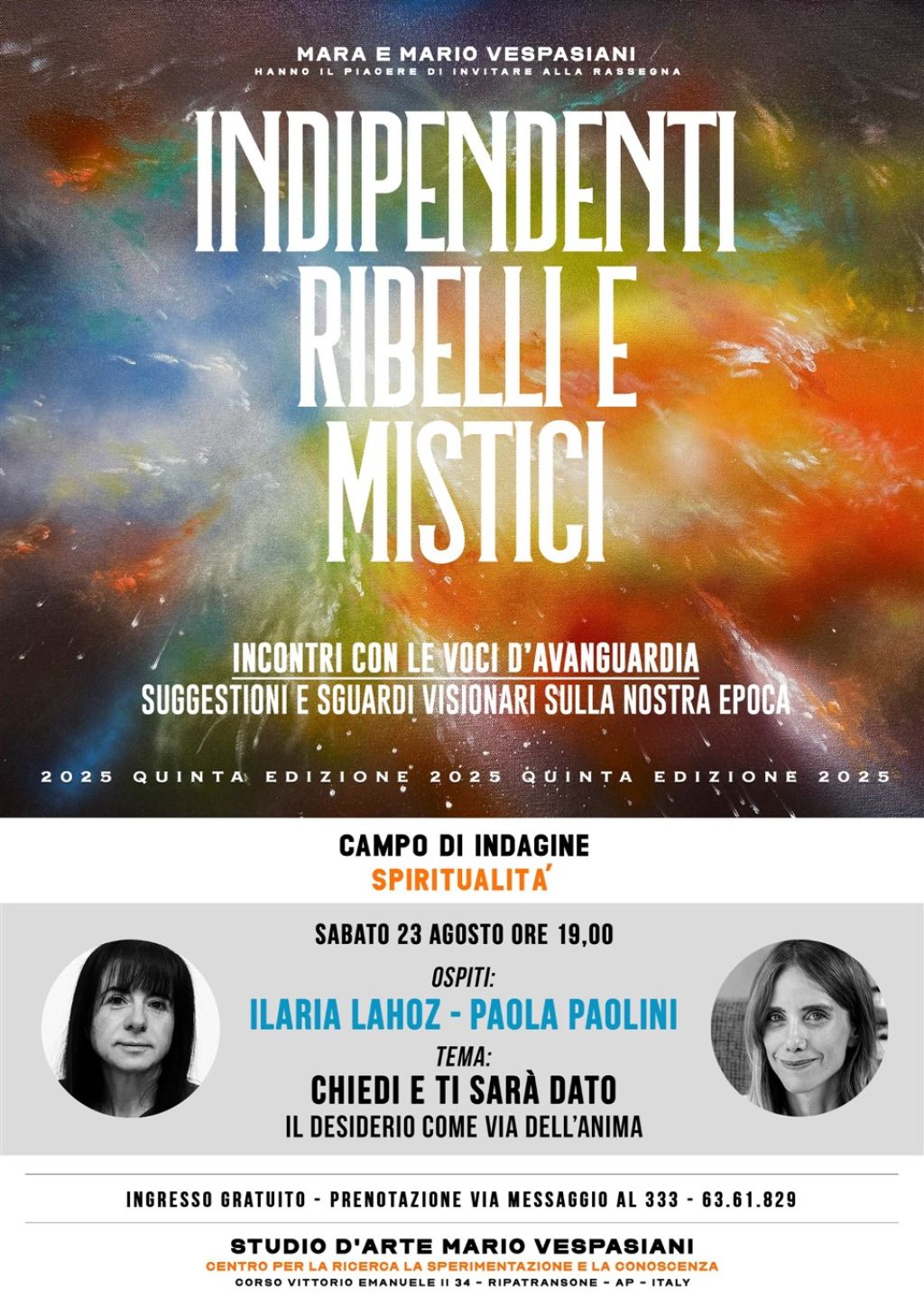 Redazione- La rassegna "Indipendenti, Ribelli e Mistici", giunta al cuore della sua quinta edizione, si conferma come un unicum nel panorama culturale nazionale, un percorso di conoscenza che, incontro dopo incontro, si addentra sempre più in profondità, passando dall'analisi del mondo alla trasformazione di sé. Dopo aver esplorato le aree del pensiero con la filosofia, la letteratura, l'architettura e l'antropologia, il format di Mara e Mario Vespasiani si prepara ora all’indagine del sentimento spirituale. Sabato 23 agosto assisteremo ad un'esperienza, ad un percorso tutto al femminile, guidato e condotto da una coppia di relatrici quali Ilaria Lahoz e Paola Paolini che affronteranno una delle domande più misteriose dell'esistenza umana: "Chiedi e ti sarà dato: il desiderio come via dell’anima".