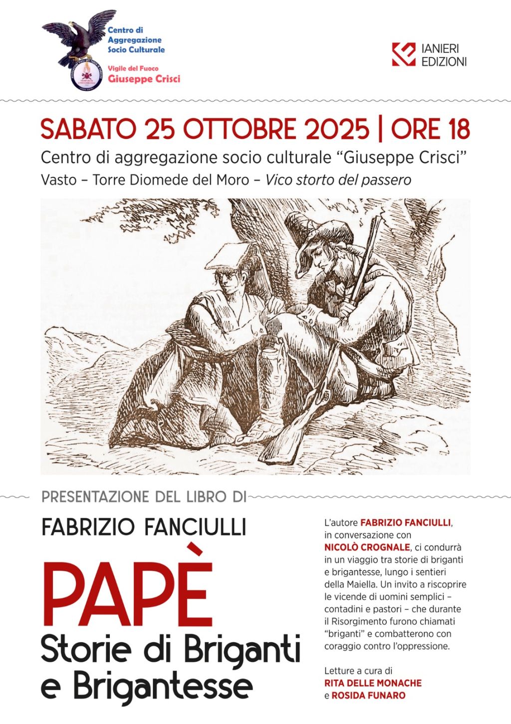 Redazione- Il centro di aggregazione socio – culturale "Giuseppe Crisci" di Vasto (Ch) si prepara ad ospitare Papè. Storie di Briganti e Brigantesse, il nuovo libro di Fabrizio Fanciulli edito da Ianieri Edizioni. La presentazione si terrà a Torre Diomede del Moro (Vico storto del passero), sabato 25 ottobre alle ore 18.00. L'autore dialogherà con Nicolò Crognale.