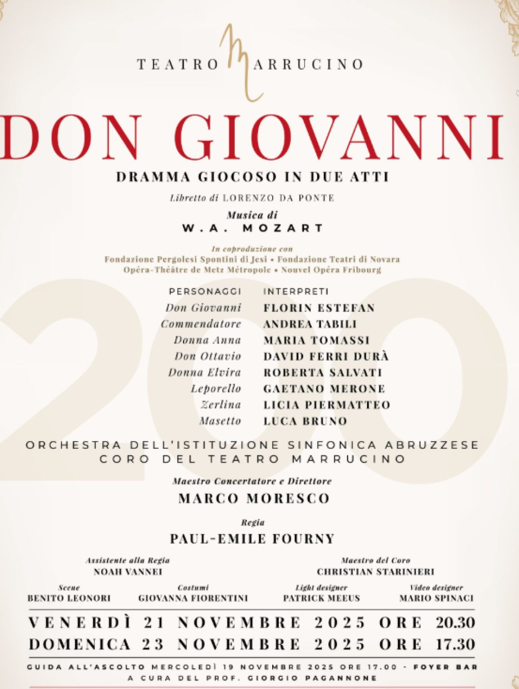 In attesa del debutto, mercoledì 19 novembre alle ore 17.00 il Foyer Bar del Teatro Marrucino ospiterà la “Guida all’ascolto” dedicata a Don Giovanni, un incontro aperto al pubblico per approfondire temi, musica e personaggi dell’opera, offrendo un’occasione preziosa per entrare nel cuore del capolavoro mozartiano.