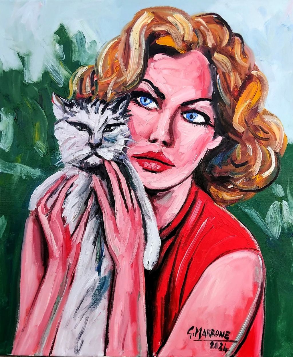 donna col gatto olio su tela 60x50 2024 donna col gatto olio su tela 60x50 2024