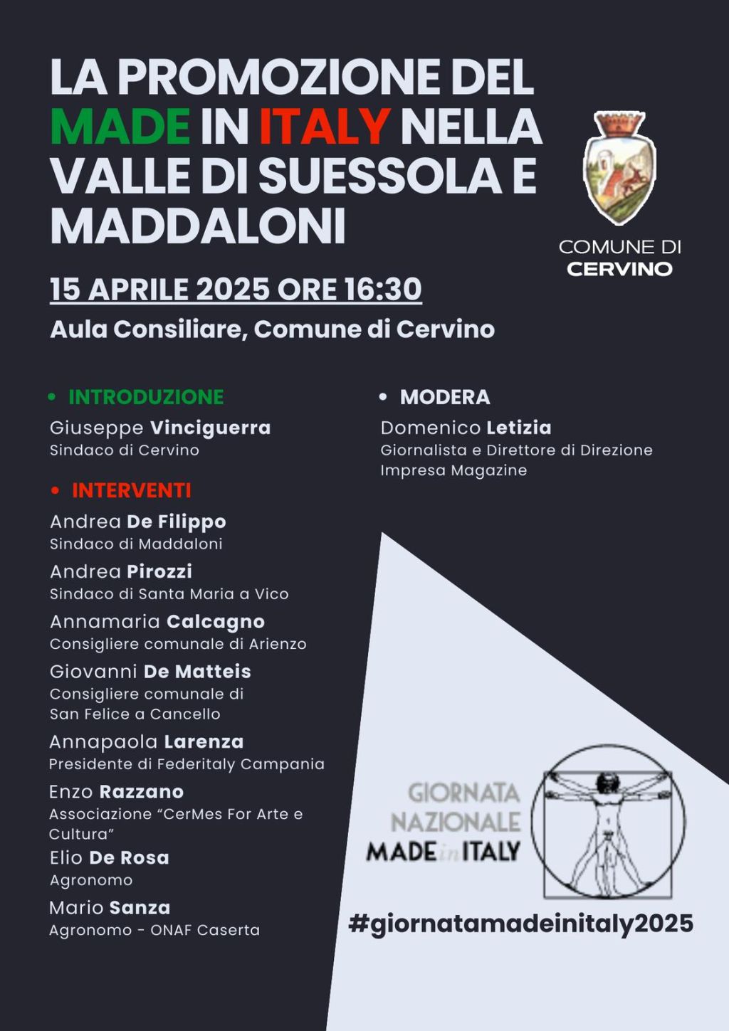 Redazione- Il 15 aprile si svolge la seconda edizione della Giornata nazionale del made in Italy, promossa dal Ministero delle Imprese e del made in Italy. La data del 15 aprile è quella della nascita di Leonardo Da Vinci, simbolo del genio e del talento italiano. Il Comune di Cervino, in provincia di Caserta, in occasione delle celebrazioni, organizza un convegno dal titolo “La promozione del Made in Italy nella Valle di Suessola e Maddaloni”, in programma per martedì 15 aprile 2025 alle ore 16:30 presso l’Aula Consiliare del Comune di Cervino. L’iniziativa si inserisce nel calendario nazionale di eventi dedicati alla valorizzazione del sistema produttivo italiano, promuovendo le eccellenze locali e il legame tra territorio, cultura e impresa. Ad aprire i lavori sarà Giuseppe Vinciguerra, Sindaco di Cervino. A seguire gli interventi di numerose personalità istituzionali e rappresentanti del mondo istituzionale, culturale e agricolo: Andrea De Filippo, Sindaco di Maddaloni; Andrea Pirozzi, Sindaco di Santa Maria a Vico; Annamaria Calcagno, Consigliera comunale di Arienzo; Giovanni De Matteis, Consigliere comunale di San Felice a Cancello; Annapaola Larenza, Presidente di Federitaly Campania; Enzo Razzano, Associazione “CerMes For Arte e Cultura”; Elio De Rosa, Agronomo e Mario Sanza, Agronomo – ONAF Caserta. Il convegno sarà moderato dal giornalista Domenico Letizia, direttore di Direzione Impresa Magazine. L’agricoltura e l’agroalimentare, grazie alle nostre produzioni di alto pregio, possono affermarsi sia sul mercato nazionale che internazionale.