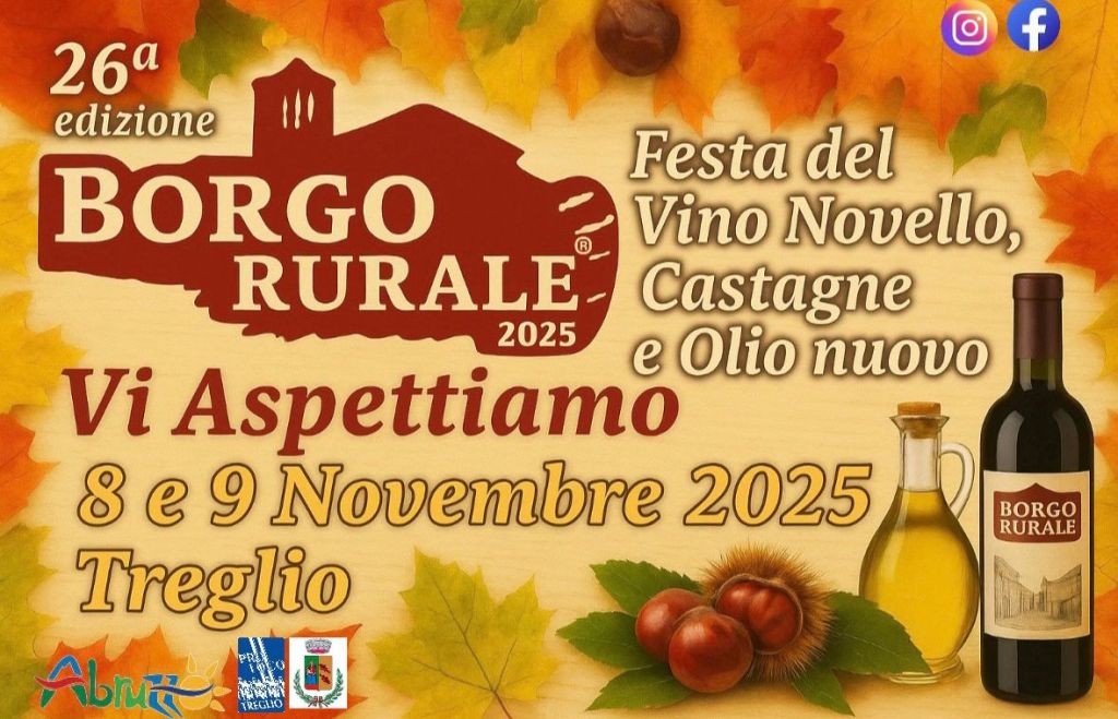 Redazione- Venerdì 31 ottobre, alle ore 12.00, al Teatro studio di Treglio (Ch) si terrà la conferenza stampa di presentazione della 26esima edizione di "Borgo Rurale, la festa del vino novello, castagne e olio nuovo".