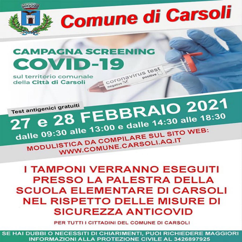 CARSOLI - 27 E 28 FEBBRAIO CAMPAGNA SCREENING TEST COVID