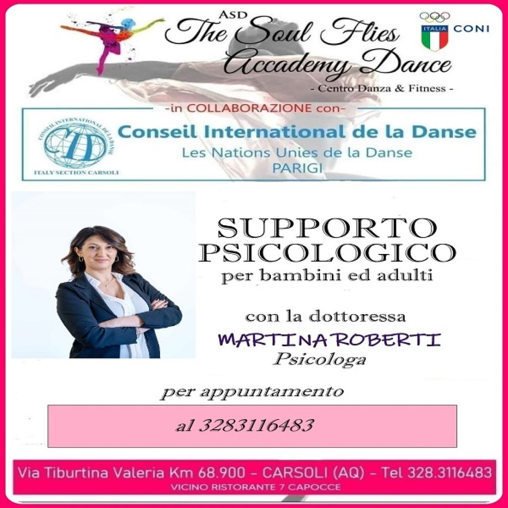 Molte persone credono che chi va dallo psicologo sia pazzo. Non è assolutamente così. Insieme allo psicologo si esplorano emozioni, si riflette su di sé, si condividono storie e si costruisce un percorso di crescita. La dottoressa Roberti riceve nel mese di Dicembre nei giorni Sabato 7 Dicembre dalle 9 alle 12 Venerdi 13 Dicembre dalle 9 alle 12 dalle 14 alle 17 Mercoledi 18 Dicembre dalle 9 alle 12 dalle 14 alle 17 per appuntamenti ASD THE SOUL FLIES ACCADEMY DANCE info 3283116483