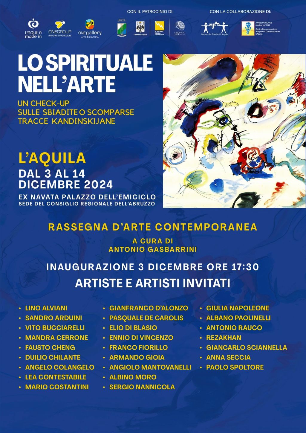 Redazione – Sarà inaugurata martedì 3 dicembre ore 17:30 a L’Aquila, presso la ex navata dell’Emiciclo sede del Consiglio Regionale d’Abruzzo, la Mostra LO SPIRITUALE NELL’ARTE - Un check-up sulle sbiadite o scomparse tracce kandinskijane, affidata alla curatela del critico d’arte Antonio Gasbarrini. L’esposizione resterà aperta fino al 14 dicembre. Promossa e organizzata dall’associazione L’Aquila Made In insieme a One Group, in collaborazione con MuBAq e con Angelus Novus, ha l’alto patrocinio della Regione Abruzzo e del Comune dell’Aquila. La rassegna metterà in mostra 25 opere d’arte contemporanea di 25 artisti abruzzesi: Lino Alviani, Sandro Arduini, Vito Bucciarelli, Mandra Cerrone, Fausto Cheng, Duilio Chilante, Angelo Colangelo, Lea Contestabile, Mario Costantini, Gianfranco D’Alonzo, Pasquale De Carolis, Elio Di Blasio, Ennio Di Vincenzo, Franco Fiorillo, Armando Gioia, Angiolo Mantovanelli, Albino Moro, Sergio Nannicola, Giulia Napoleone, Albano Paolinelli, Antonio Rauco, Rezakhan, Giancarlo Sciannella, Anna Seccia, Paolo Spoltore.