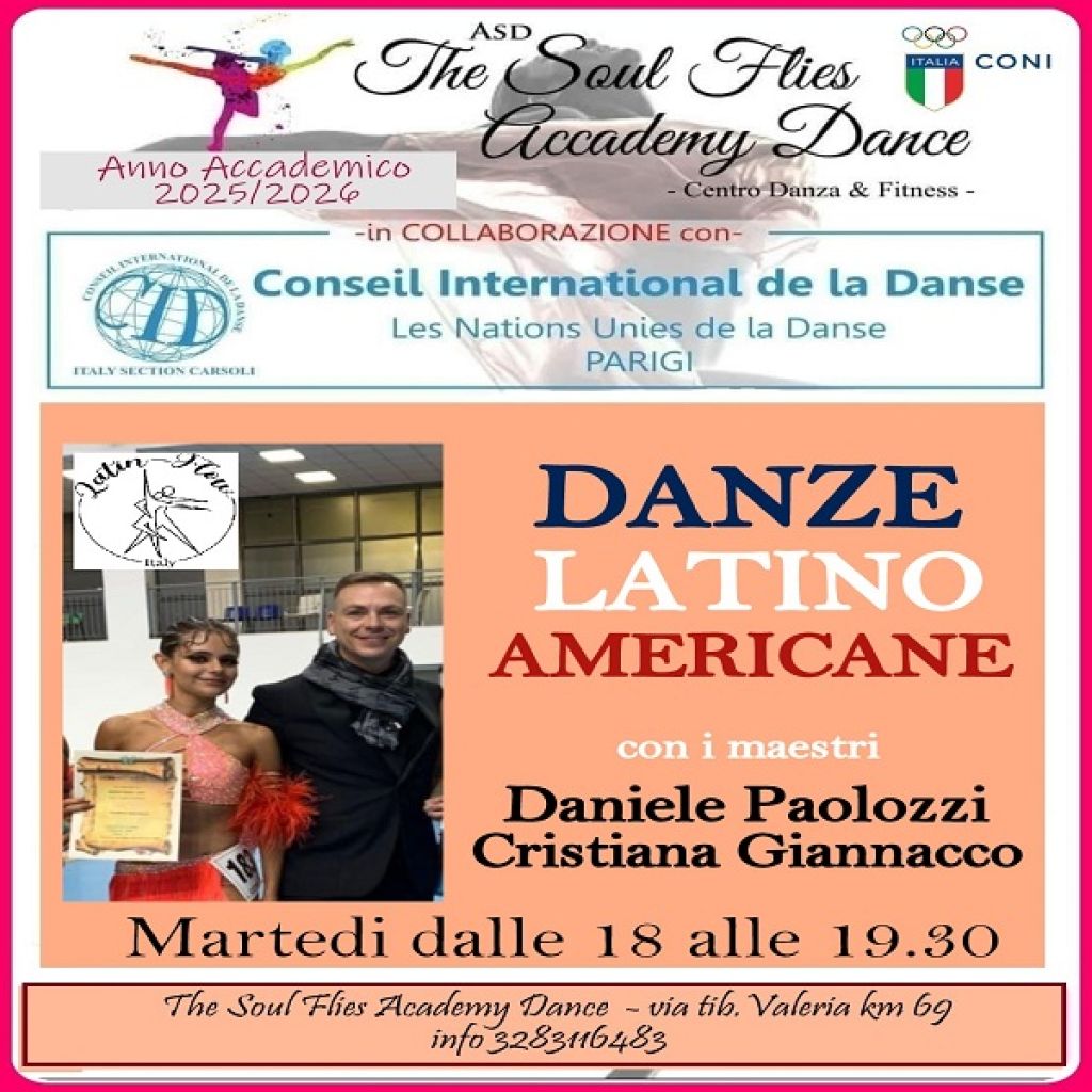 Redazione- Un nuovo corso sta per iniziare all'Accademia di danza THE SOUL FLIES ACCADEMY DANCE di Carsoli. Infatti il 30 Settembre alle 18, si svolgerà l'open Day del corso di BALLO LATINO AMERICANO, con i maestri DANIELE PAOLOZZI, e CRISTIANA GIANNACCO. Il corso si svolgerà tutti i Martedi dalle 18 alle 19.30. Le Danze Latino-Americane comprendono il Samba brasiliano, il Cha cha cha, la Rumba cubani, il Paso Doble spagnolo e il Jive nord-americano.