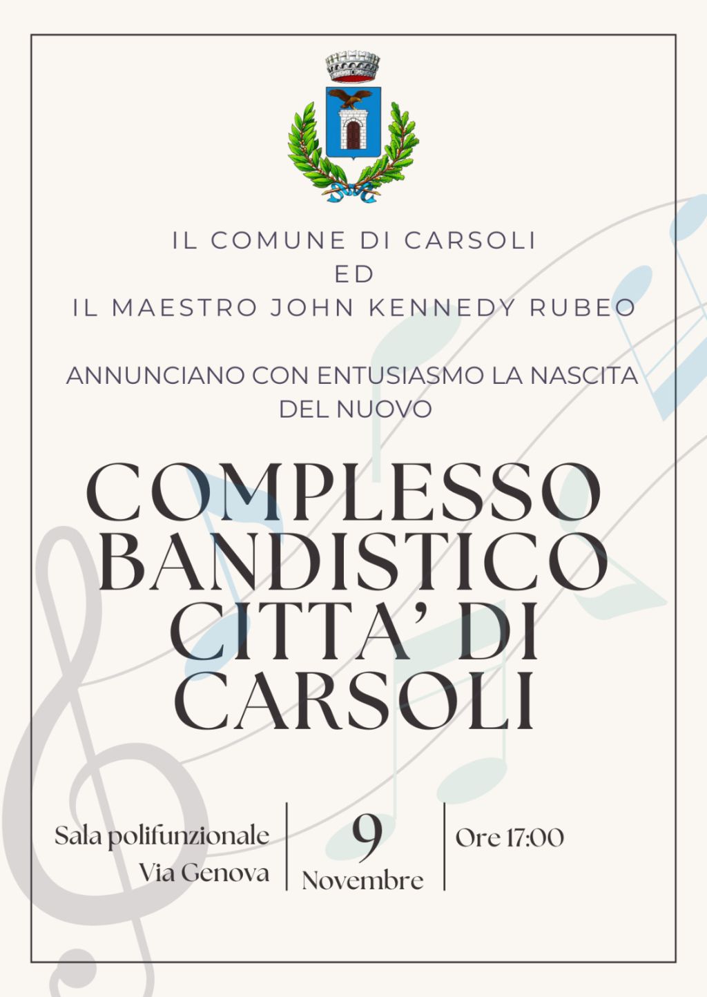 Redazione- Il Comune di Carsoli compie un passo importante a favore della cultura e della formazione musicale, dando ufficialmente avvio alla costituzione di un complesso bandistico locale e di una scuola di musica aperta a tutte le fasce d’età, dai bambini di 6 anni fino agli adulti.