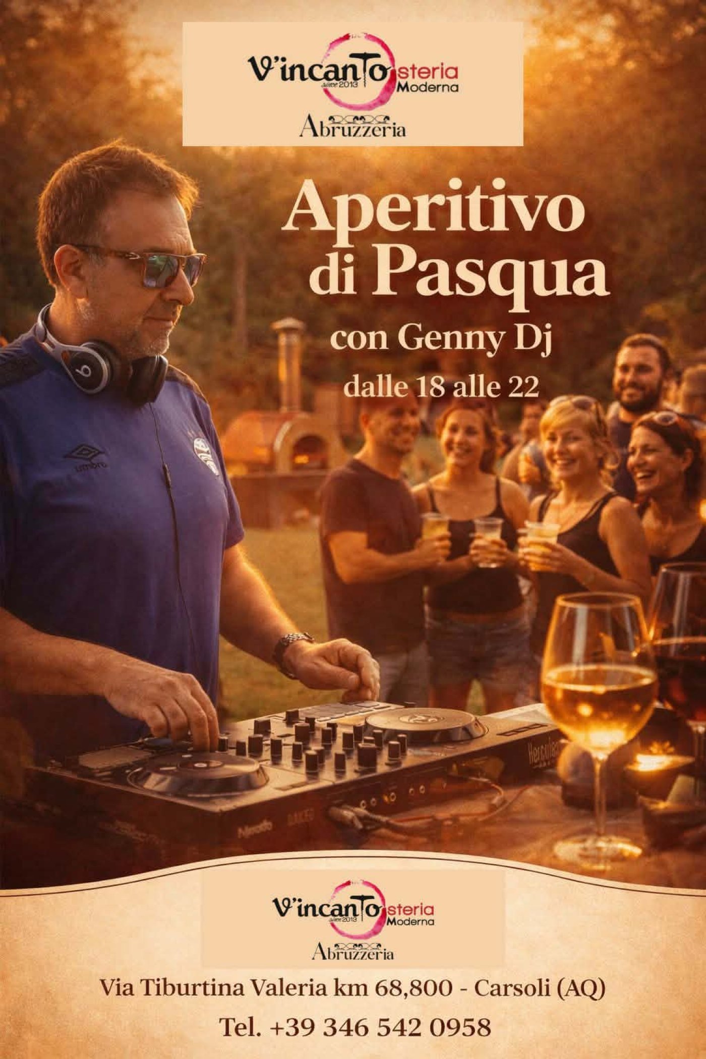 Redazione- Un grande appuntemanto con DJ GENNY, dopo il pranzo ,per l'aperitivo di Pasqua, dalle 18 alle 22 presso l'Osteria Moderna V'INCANTO di Carsoli.