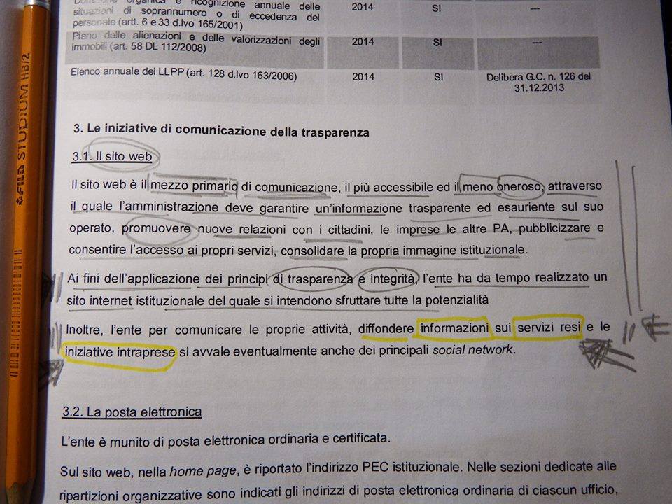 La 'famosa' giornata della trasparenza, per una Amministrazione penso sia uno degli appuntamenti più importanti a livello partecipativo e di coinvolgimento diretto del cittadino dentro le Istituzioni. In parole povere, è un' occasione in cui gli amministratori e i tecnici comunali si mettono a disposizione, PUBBLICAMENTE, per il cittadino, nella casa di tutti: "il Comune", creando così un 'rapporto' diretto, uno scambio di opinioni, di domande e risposte, ripeto: DIRETTE, senza nessun intermediario o filtro. Ricordo a tutti che, ad esempio, durante il Consiglio Comunale, NON è permesso (se non autorizzato precedentemente..) al cittadino di intervenire nei lavori d'aula, quindi PUBBLICAMENTE durante i Consigli i cittadini diventano puri e semplici spettatori, cosa contraria, in questa giornata invece, sarà possibile intervenire e rendersi attori protagonisti confrontandosi liberamente su tutto ciò che riguarda l'amministrazione, sia politica che tecnica. Come segnalavo già l'anno scorso, sul programma triennale della trasparenza e l'integrità, vi è scritto che l'appuntamento dovrebbe svolgersi durante il mese di ottobre, (cit. Il Comune organizza annualmente la Giornata della Trasparenza, di norma nel mese di ottobre, che costituisce un'occasione privilegiata di ascolto e di confronto con i cittadini....), ma come per l'amministrazione D'Antonio questa giornata è stata rimandata a Dicembre...(???). Invito a rileggere per chiunque fosse interessato, i miei post dell' anno scorso (4 su questo tema), attentamente il post del 12 dicembre, quello riferito al racconto di quella giornata, ci sono questioni tuttora attualissime....Secondo Voi, il cittadino come rispose a quell'appuntamento rivolto esclusivamente a lui? Su 5.393 abitanti (fonte Wikipedia), quanti partecipanti ci furono a quell'incontro svoltosi alle 15:00 di pomeriggio e NON come in questa occasione alle 10:00 di MATTINA? 1 persona! Una SOLA persona, "IO". Pensate, a quella riunione, dopo una forte polemica polito/tecnica nata 'come sempre, e SOLO come sempre' sulla stampa, qualche forza politica di opposizione neanche si presentò all'incontro...Forse la stampa conta/contava più di un appuntamento pubblico?!! Personalmente non potrò (quasi sicuramente) esserci a quell'ora, alle 10:00 sono a lavoro –fortunatamente-, forse come tanta altra gente, ma invito, come ho fatto ripetutamente anche l'anno scorso, CHIUNQUE a partecipare e a "CHIEDERE"; gli argomenti di discussione non mancano, dai debiti passati e approvati in Consiglio a quelli appena stipulati, alle scuole, allo sport, all'ambiente, ai lavori pubblici, ecc.., insomma vedete Voi quale argomento da portare e PARTECIPATE.