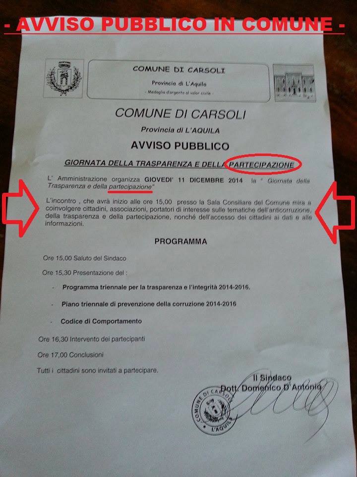 Carsoli-Sandro Proia, in merito alla giornata della trasparenza e della partecipazione organizzata dal Comune di Carsoli per Venerdì 11 Dicembre,in un suo Post sulla sua pagina Facebook scrive:<<